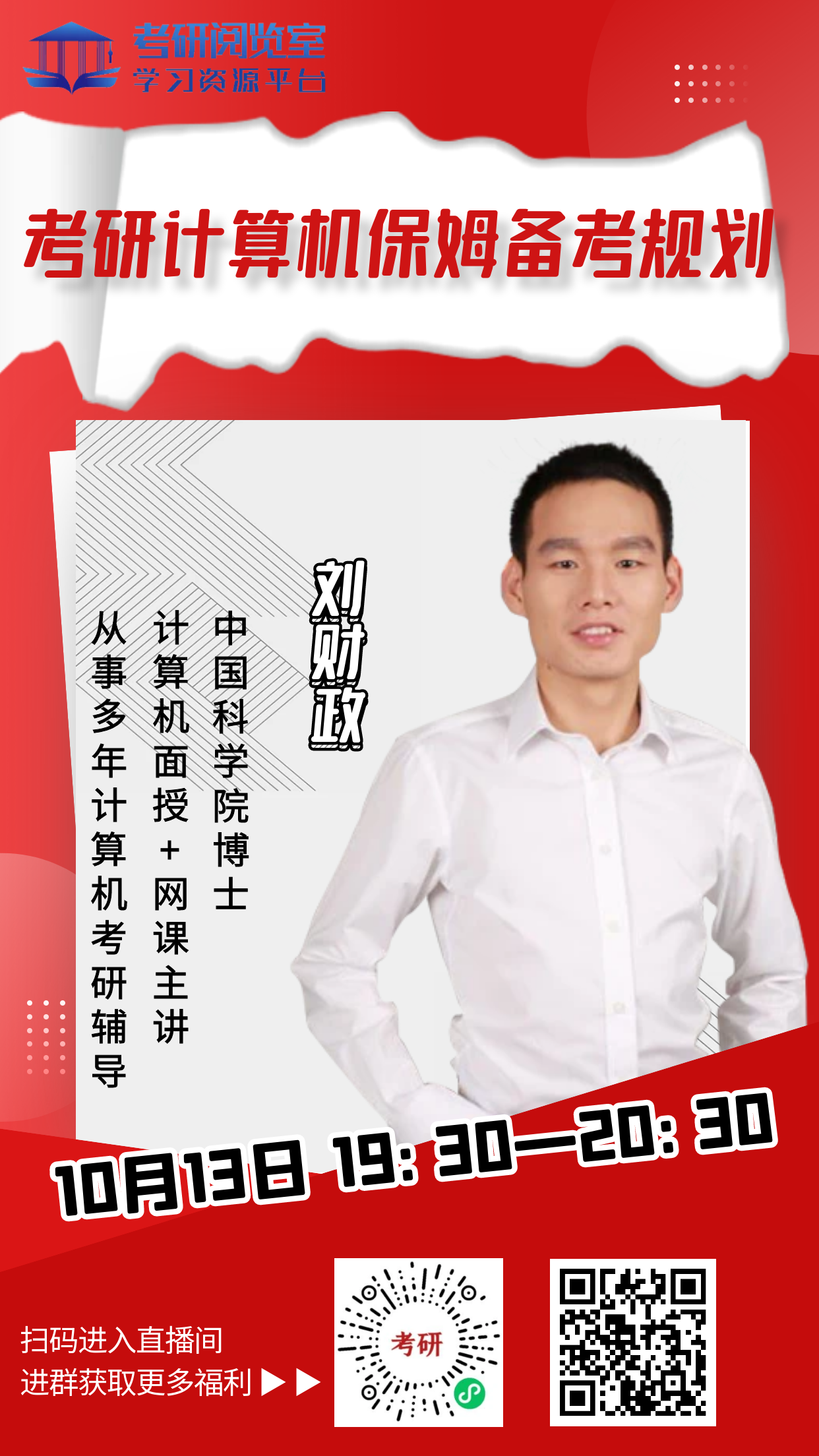 刘财政老师深耕计算机考研辅导多年,讲课幽默风趣又专业扎实,超受学生欢迎!直播将以考试实战为核心,从突破知识点切入,帮你搭建知识体系,实现 “点面结合”,既能吃透考点,又能掌握应试技巧,轻松提升备考效率!