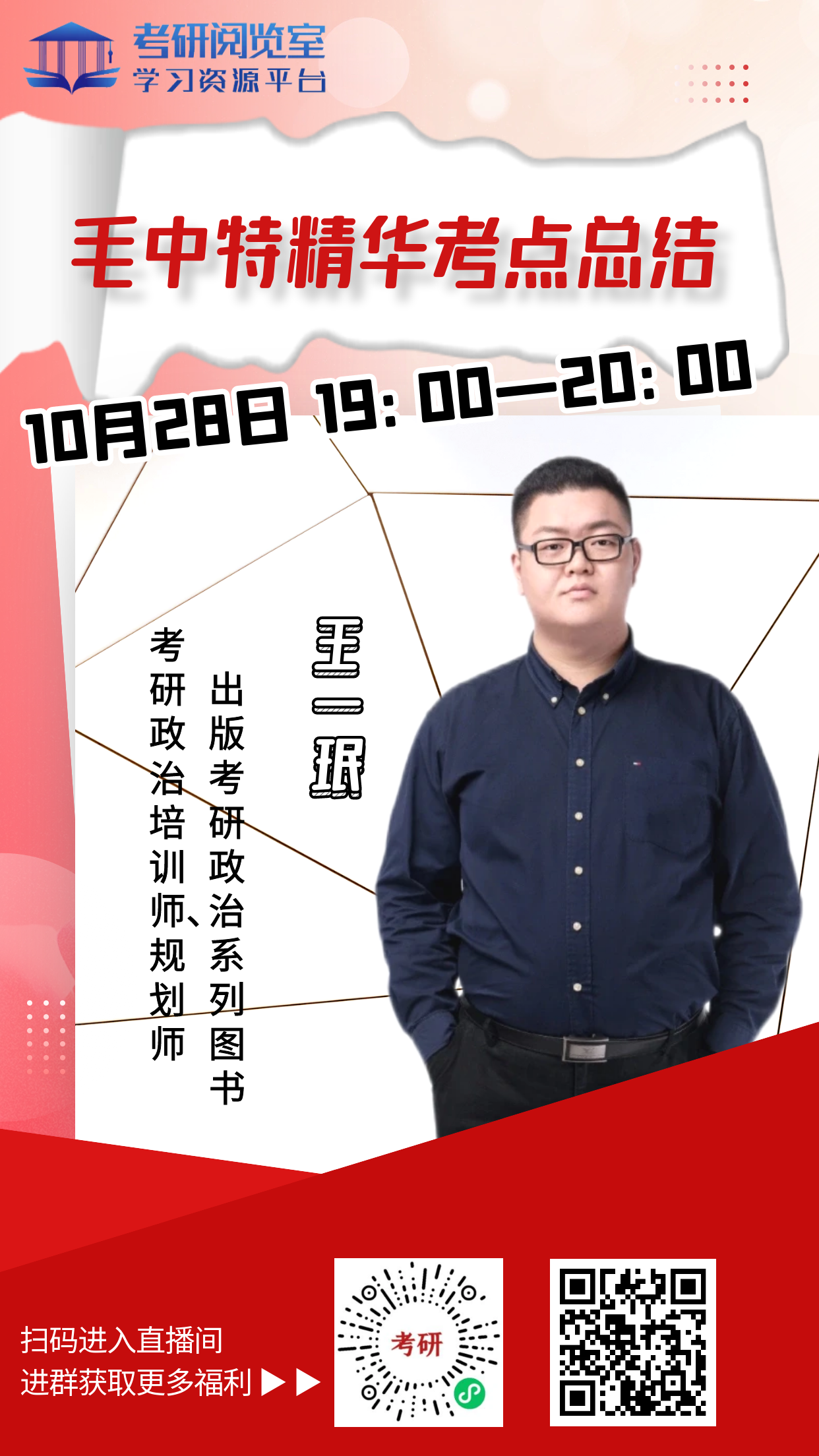王一珉老师带来毛中特精华考点总结!直播将直击毛中特考试重点,帮你剔除冗余内容,精准掌握核心考点,让你在有限时间内高效复习,轻松应对毛中特考试,助力考研提分!